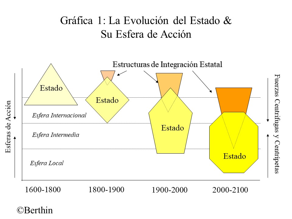 Como se experimentó en los últimos cinco siglos, el Estado ha evolucionado continuamente. Lo hizo no solo porque la esfera de acción y, por ende, la pluralidad de instituciones se ha expandido gradualmente, sino también porque su unidad se ha reconstituido políticamente continuamente como resultado de fuerzas o variables centrífugas y centrípetas. Como se ilustra en la Gráfica 1, desde mediados del siglo XVII el Estado expandió su esfera de influencia de la dimensión internacional a la intermedia y local. Su expansión y transformación también han sido moldeadas y remodeladas por fuerzas centrífugas (desde afuera) y centrípetas (desde adentro). Estas fuerzas reflejan la dimensión política, la constante desagregación y agregación del poder, los niveles de voluntad y legitimidad políticas y la evolución de las instituciones y comunidades. Las tendencias de transformación han sido más intensas y complejas en los últimos 150 años y, dadas las fuerzas centrífugas y centrípetas actuales en juego, se espera que aumente la intensidad y complejidad de la transformación estatal.