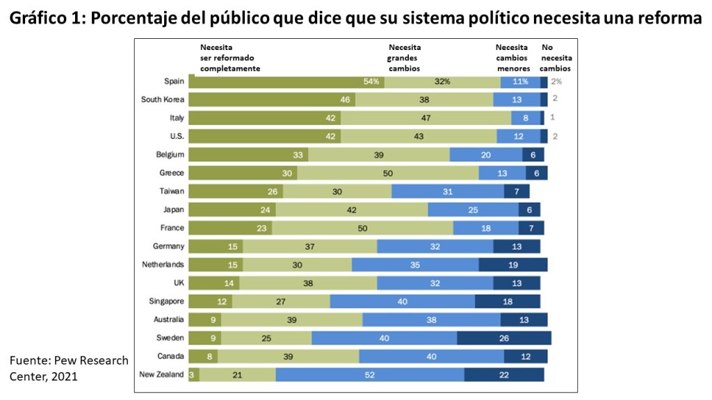 Tomará tiempo reconstruir la gobernabilidad democrática y requerirá hacer las cosas de manera diferente y mejor que antes. Los datos muestran que la insatisfacción con la gobernabilidad democrática es real. No hay un solo problema que impulse esta insatisfacción, pero parece estar relacionada con la falta de oportunidades económicas, una creciente sensación de desigualdad y una desconfianza general en el gobierno, la sociedad en general y en las personas. Por ejemplo, un estudio reciente sobre América Latina y el Caribe muestra cómo la desconfianza suprime el crecimiento económico y la innovación, y distorsiona la toma de decisiones democráticas, impidiendo que los ciudadanos exijan mejores servicios públicos, se unan a otros para controlar la corrupción y hagan sacrificios colectivos para el beneficio de todos. Otro estudio reciente del Pew Research Center apunta a las tendencias de deterioro de normas democráticas y las libertades civiles, ya que se ha visto que las instituciones democráticas no abordan cuestiones clave. Por lo tanto, el auge del autoritarismo y el populismo puede ser menos una causa y más un síntoma de los males de la gobernabilidad democrática. El mismo estudio de Pew muestra que una gran proporción de personas en todo el mundo reconocieron que sus sistemas democráticos deben reformarse (Ver el Gráfico 1 a continuación).